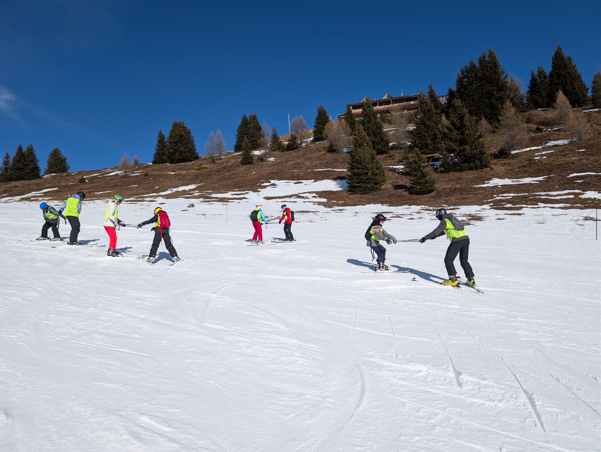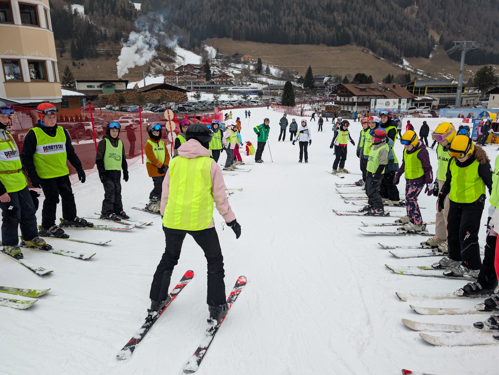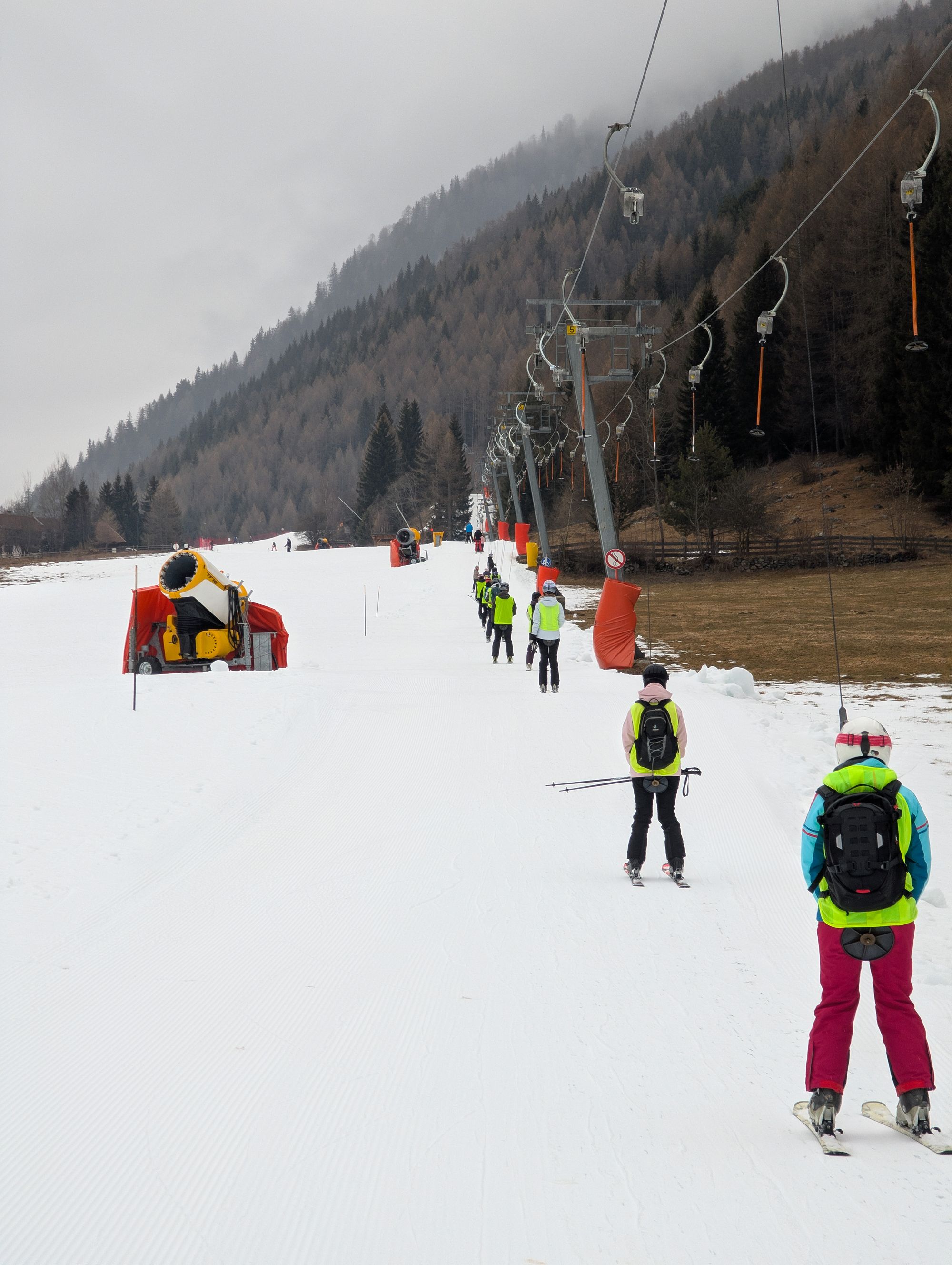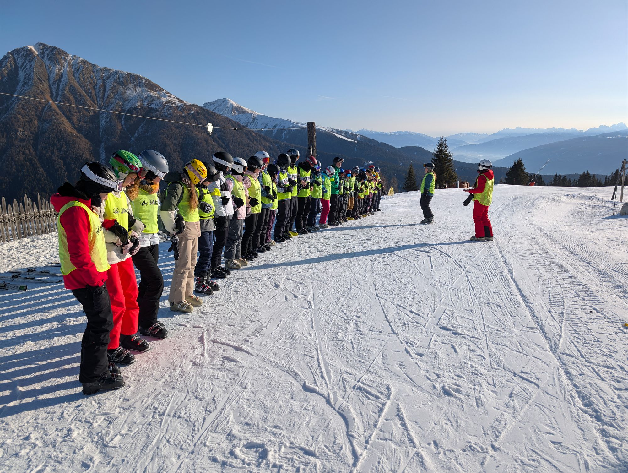 So schnell wie die Zeit verging, begann auch schon der 3. Skitag- wie immer mit einem ausgewogenen Frühstück. Wie gewohnt holte uns der Bus pünktlich um 9:00 Uhr ab und brachte uns ins Skigebiet nach Vals. Wir machten uns bereit, um mit der Gondel auf den Berg zu fahren, denn dort wartete eine spaßige Erwärmung auf uns, ausgedacht von Johanna und Helene. Mit den trendigen Liedern „Gute Laune“ und „Links Rechts“ wurde uns sehr schnell warm und wir konnten uns schließlich fröhlich gestimmt den Pisten zuwenden. Um unsere technischen Fähigkeiten individuell zu verbessern, teilten wir uns in fünf Gruppen auf: